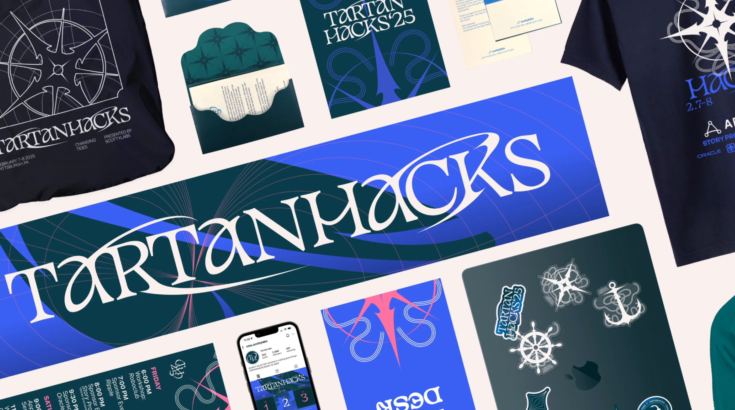 A visual identity for TartanHacks, Carnegie Mellon’s annual hackathon hosted by ScottyLabs.