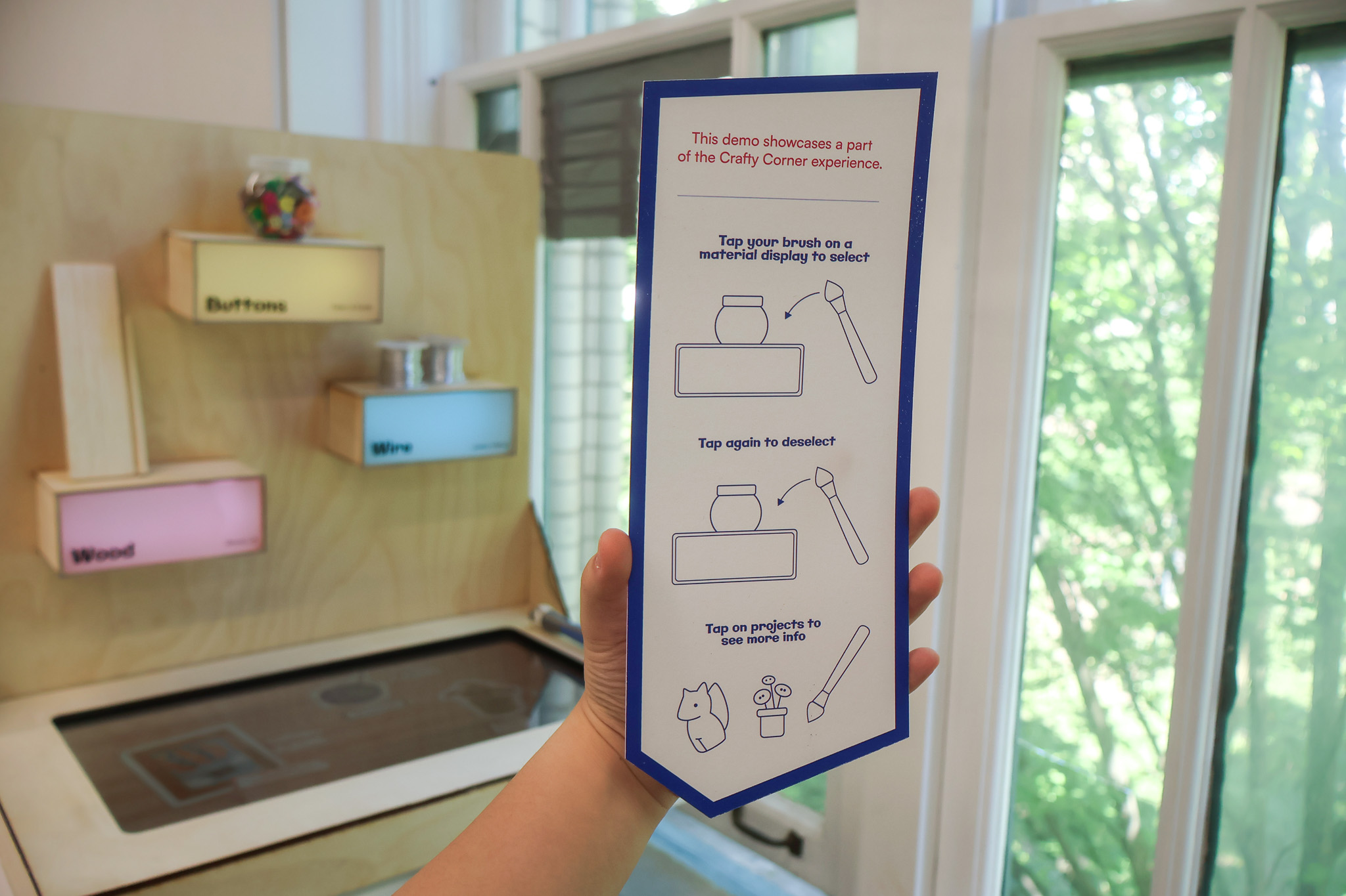 The map helps visitors locate the materials featured at the interactive station. A QR code links to full project tutorials, allowing them to revisit the projects anytime.
